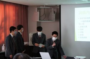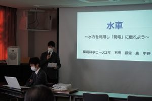 2022年2月10日 / 最終更新日時 : 2022年2月10日 エクセラン 未分類 環境科学 課題研究発表会 2月3日(木) 環境科学コース3年生が、課題研究授業のまとめとして学習発表会を行いました。 今年も「水」をテーマに学習しており、『地域の「湧き水」を守るために考える!』というテーマで、グループごとに調査・研究したことを発表しました。 コメントを残す コメントをキャンセルコメントを投稿するにはログインしてください。