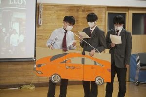 異文化理解の授業では1年間を通して韓国語の学習をしており、韓国語で自己紹介をした後、各グループでシナリオを考えた、韓国語の劇を披露しました。
