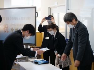 今春卒業した福祉科3年生の第35回介護福祉士国家試験合格報告会を行いました。