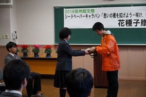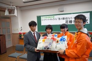 2018全国総文祭シードペーパーキャラバンに活用していただくため本校から、ひまわりやアゲラタムなどの花の種子を実行委員会の生徒に贈呈しました。