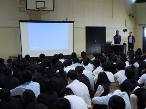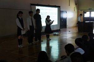 続いて、生徒会の総務を中心としたメンバーが「災害時エクセラン高校のできること」と題してプレゼンをしてくれました。災害時に活躍した高校生の活動を例にあげながら、本校では何ができるかを提案してくれました。
