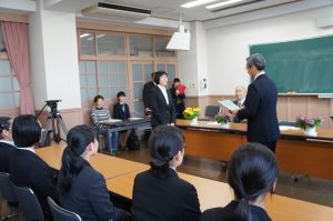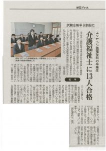 卒業した、福祉科14名が受験した「介護福祉士」の結果が3月17日に発表され、見事13名が合格、そのうち12名が報告に訪れてくれました。卒業して間もないですが、合格で自信を深めた凛々しい姿を見せてくれました。