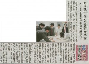 2019年4月24日 / 最終更新日時 : 2019年4月24日 エクセラン 美術科・美術部 あべ弘士さんのワークショップに参加します 本校美術部生徒が、4月27日(土)~4月29日(月)に信毎メディアガーデンで開催される「絵本作家あべ弘士さん」の親子向けワークショップのアシスタントとして参加します。その事前準備が信濃毎日新聞に掲載されました。 コメントを残す コメントをキャンセルコメントを投稿するにはログインしてください。