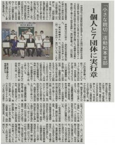 2019年8月3日 / 最終更新日時 : 2019年8月3日 エクセラン 未分類 「小さな親切」運動松本支部受賞 8月2日(金) ↑8/3付 市民タイムスより 本校が、「小さな親切」運動松本支部(主催市民タイムス)に選出され受賞しました。長年に渡る松本市への花種子贈呈、園芸活動、信州花フェスタへの参加が受賞理由です。当日は、学校を代表して生徒会長が授賞式に参加しました。 コメントを残す コメントをキャンセルコメントを投稿するにはログインしてください。