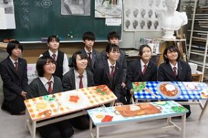 本校美術科1年が担当し、朝食・昼食・夕食をテーマにした絵柄に仕上げました。