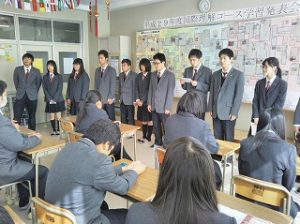 2月27日(火)13:00~本校国際教室で平成29年度普通科国際理解コース学習発表会が行われました。平日のお忙しい中ご参観いただきました皆様誠にありがとうございました。2年生はUNIQLOが全国の小中高校と行っている“届けよう、服のチカラ”プロジェクトに参加しての活動報告、3年生は2年次に取り組んだ同プロジェクトの学びを活かしての難民問題や国際情勢などについて発表しました。国際理解コースがこのプロジェクトに参加して丸5年が経ちますが活動への取り組みと関連学習が評価され、服のチカラアワード2017で「審査員特別賞」を受賞することができました。これを励みに今後も活動を継続していく予定です。引き続きご協力ご支援お願いいたします。ありがとうございました。