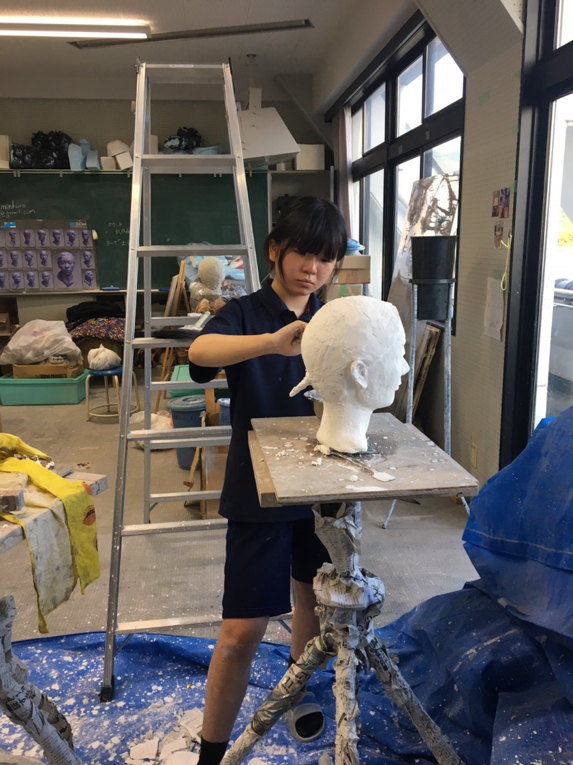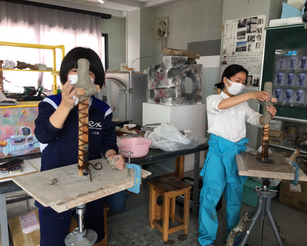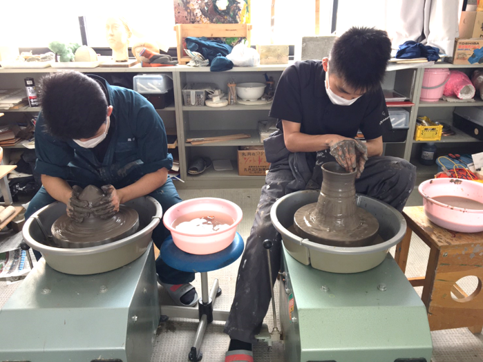 3年生…器(陶芸/電動ろくろ)、自画像、石彫(滑石)、模刻(闘志像)、自刻像等